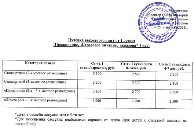 Цены на путевку выходного дня в Cанаторий «Соколиный Камень» 2025.09